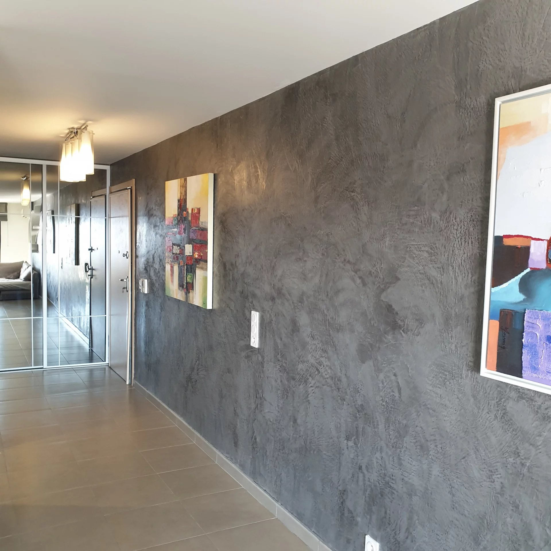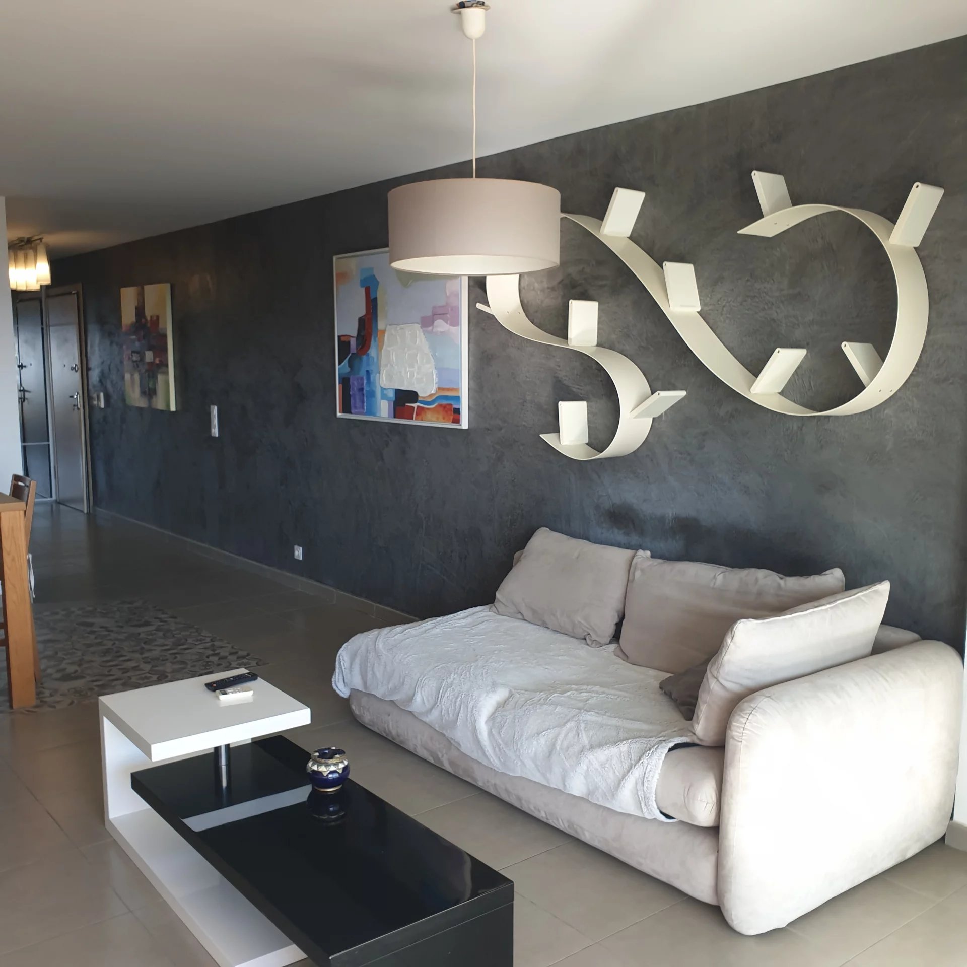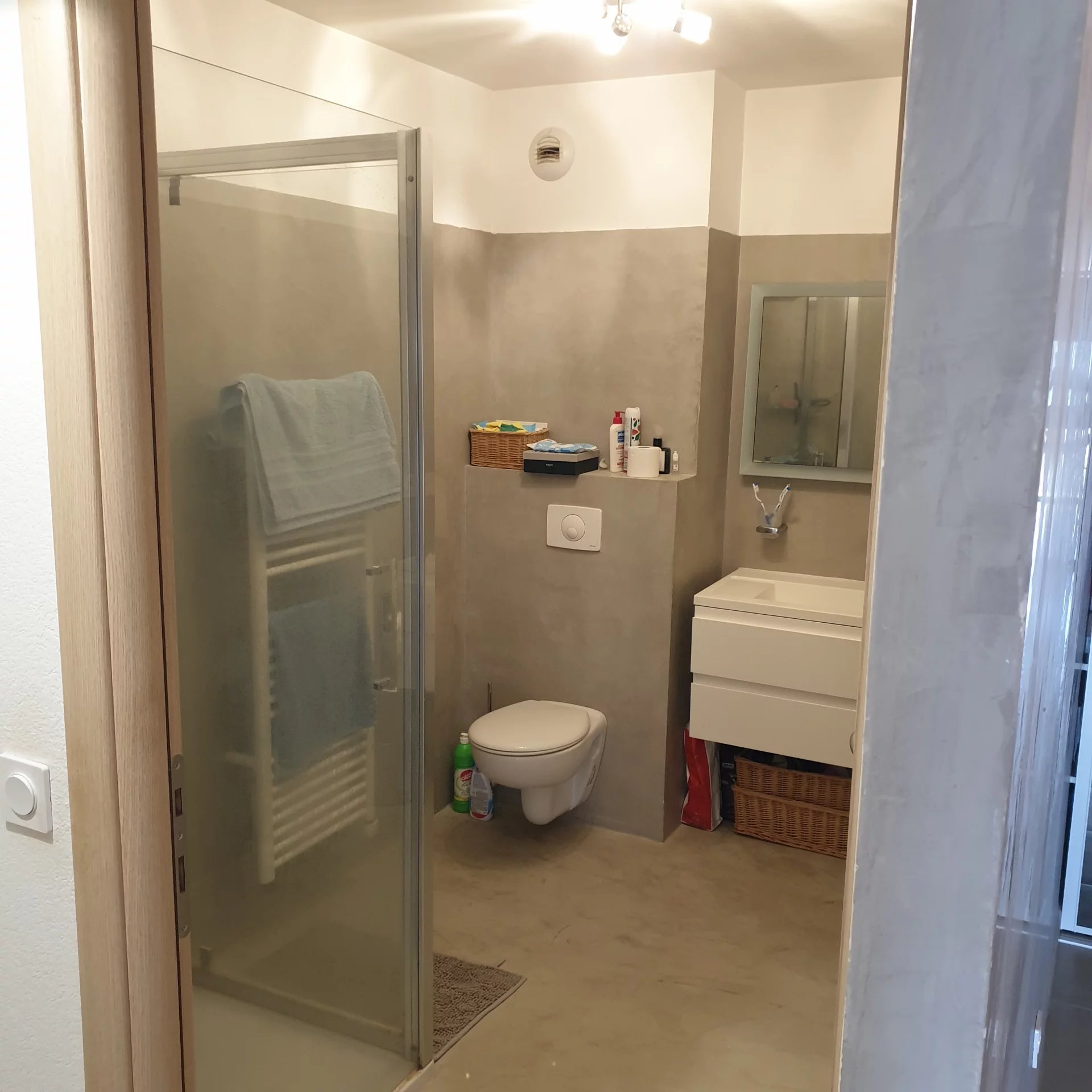 Les deux chambres sont équipées de grands placards de qualité. La cuisine est entièrement équipée et ouverte sur le salon. Le + : un grand cellier avec porte à galandage afin optimiser les rangements. Vous trouverez également un placard de rangements dans le hall d’entrée. Un magnifique tadelak donne une ambiance cozy et sophistiquée. La salle de bain en béton ciré est tout simplement charmante.
