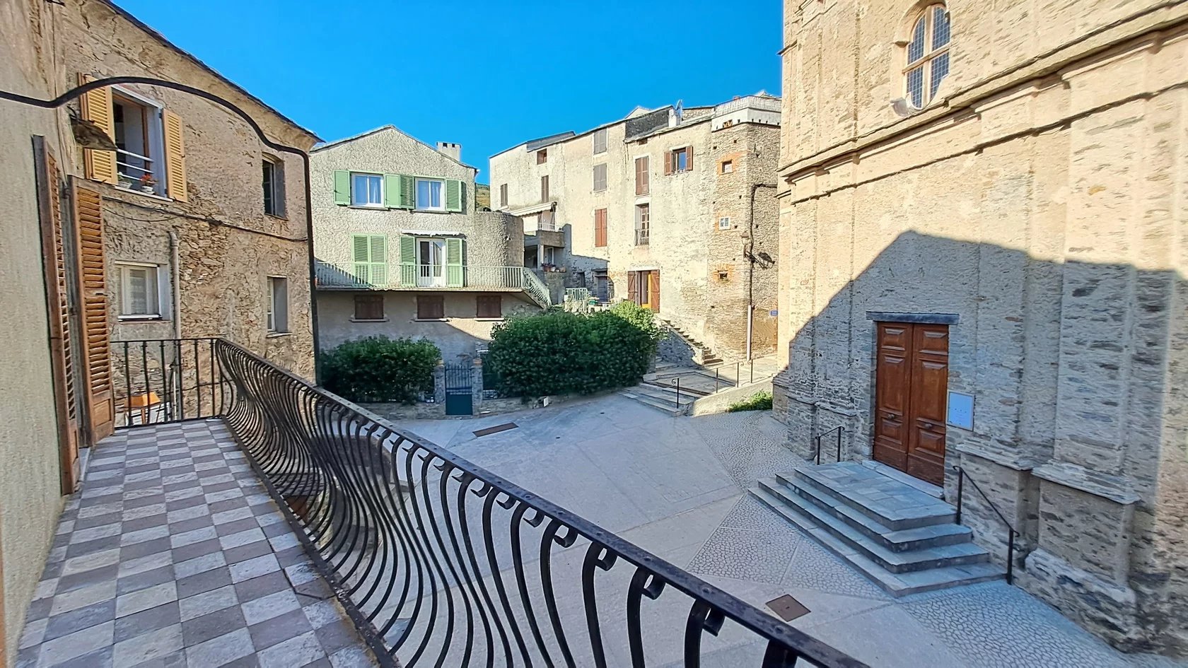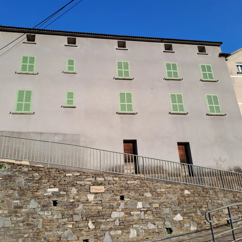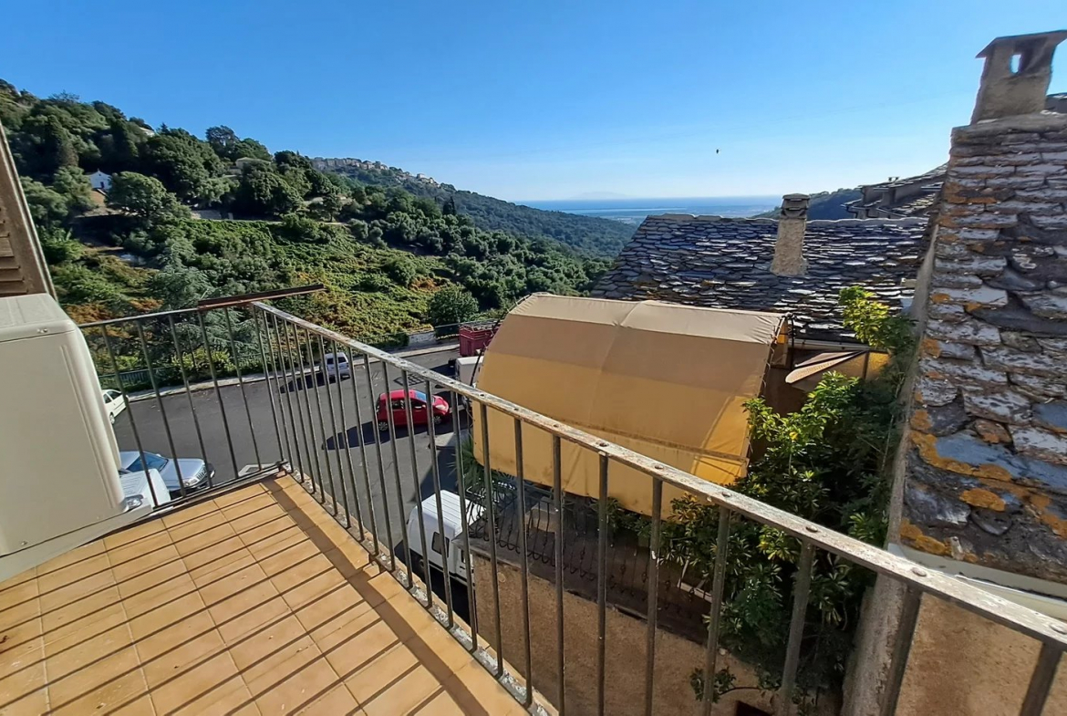 Exclusivité Zénith Immobilier Lucciana village, 2è étage sans ascenseur, appartement T3 rénové 75m² dans vieil immeuble, deux petites terrasses et une cave à côté. Cuisine-salle à manger, séjour climatisé, deux chambres, salle de douche avec toilettes, petite terrasse avec vue mer, et seconde terrasse côté église du village.