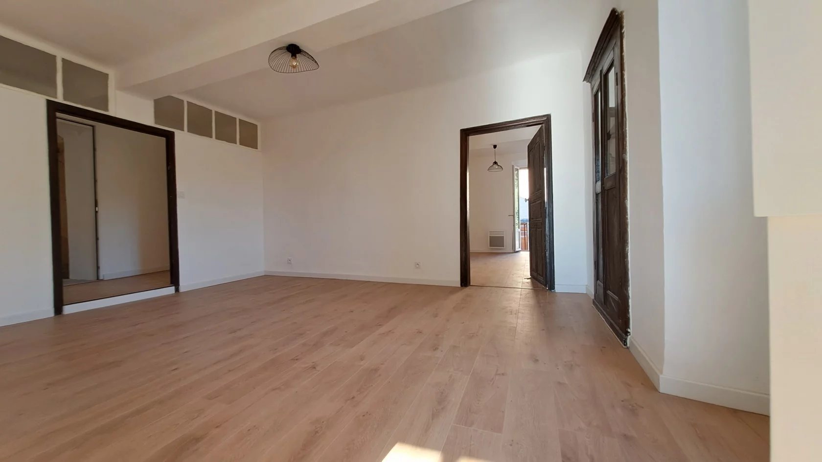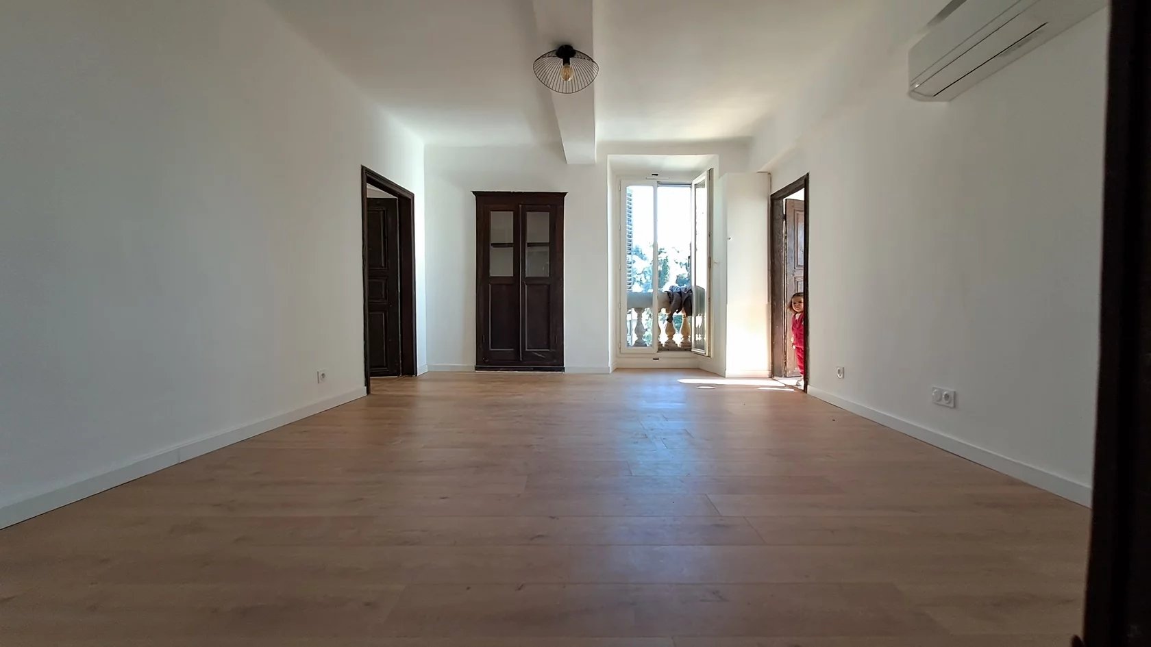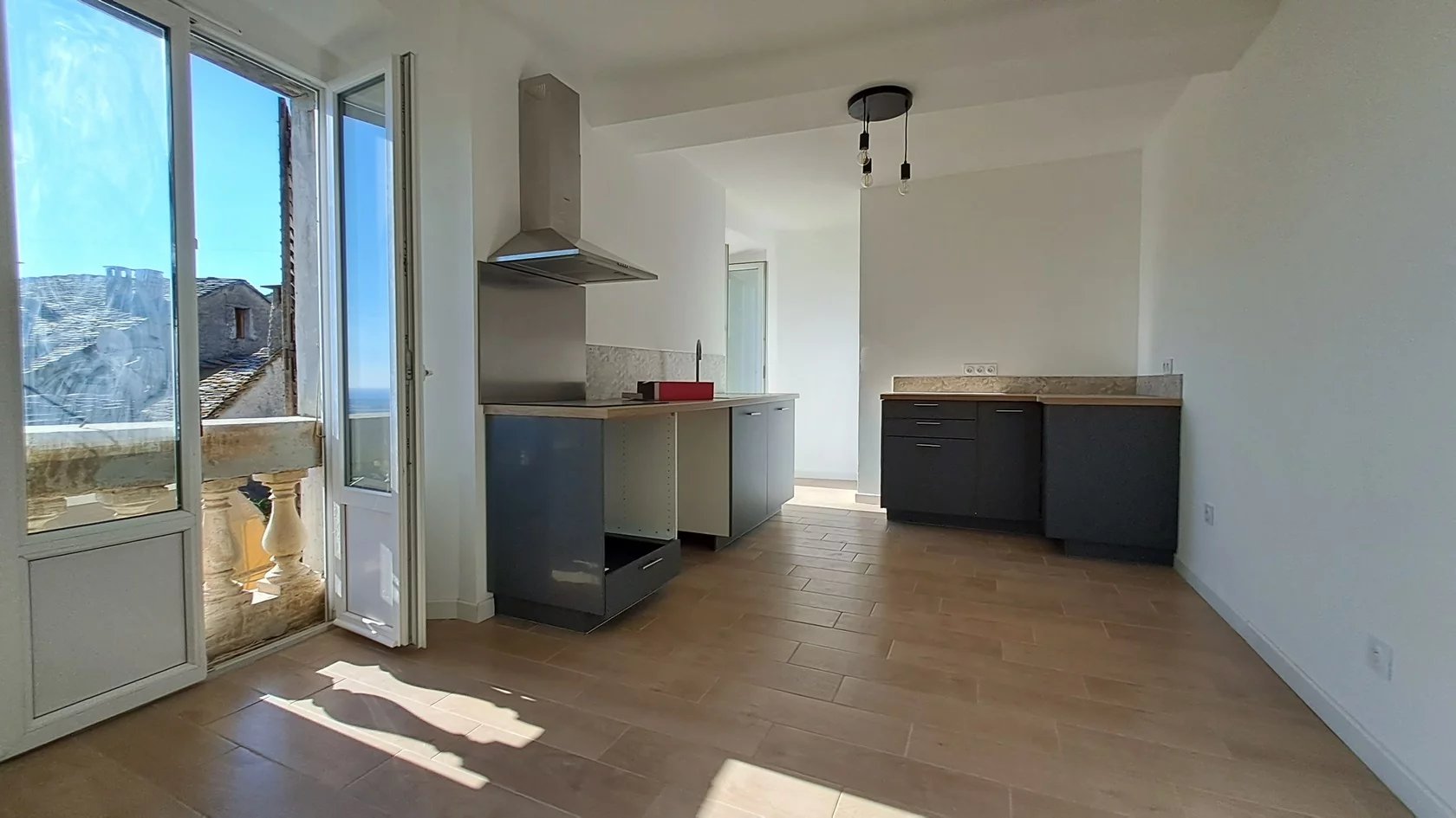 Exclusivité Zénith Immobilier Lucciana village, 2è étage sans ascenseur, appartement T3 rénové 75m² dans vieil immeuble, deux petites terrasses et une cave à côté. Cuisine-salle à manger, séjour climatisé, deux chambres, salle de douche avec toilettes, petite terrasse avec vue mer, et seconde terrasse côté église du village.